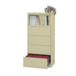 Contemporary styling features clean, sleek lines, making these KI Lateral File Cabinets ideal for any decor.Full-length recessed handles extend drawers 100% on heavy-duty, ball-bearing suspensions. Safety interlock system prevents more than one drawer from opening at once. Direct drive lock with removable core protects and tamper-proof security bars along sides protect stored contents from theft or damage. High-sided 11"H drawers accept letter or legal size files. Five-high units include a reinforced fixed shelf at the top with two dividers to store binders or catalogs. Top opening, receding door slides, with smooth gliding nylon runners, conceals shelf contents. All cabinets feature adjustable glides to ensure proper leveling and stability.