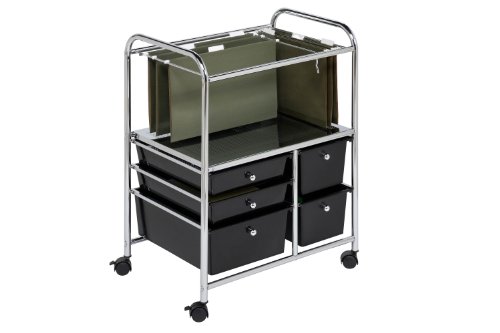 Honey-can-do crt-01512 5-drawer hanging file rolling office cart, chrome/black. A contemporary, mobile filing cart with five pull-out drawers. The top filing space holds legal or letter hanging files to organize any size documents and the perforated metal base supports heavy files. Five black plastic drawers with chrome pull knobs slide open to store paper and supplies. The cart moves easily on four smooth rolling casters then locks in place. Hanging folders not included.
